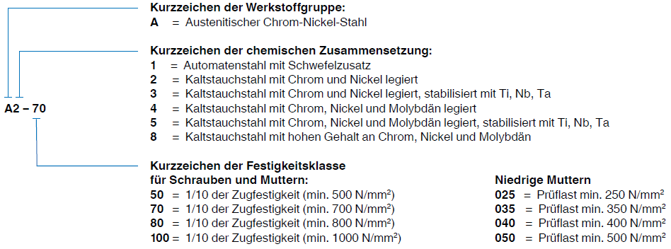 Bezeichnungsbeispiel für eine Mindesthärte von 250 HV: A4 25 H, austenitischer Stahl, kaltverfestigt