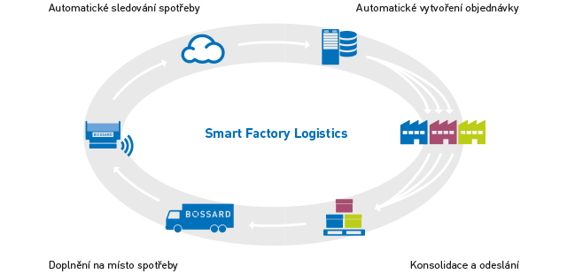 - Společnost Bossard sloučí tok zboží a vystaví hromadnou fakturu. Dodávka se pak uskuteční buď do místa použití nebo do místa příjmu zboží.