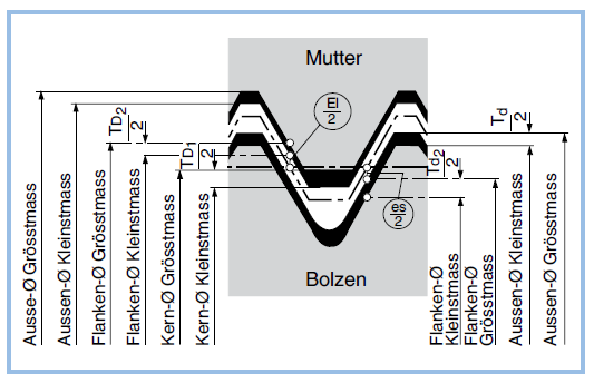 Schrauben- und Muttergewinde haben unterschiedliche Toleranzlagen, wobei die Schraubengewindeabmessungen sich am Nennmass und darunter bewegen, die Muttergewindeabmessungen am Nennmass und darüber.