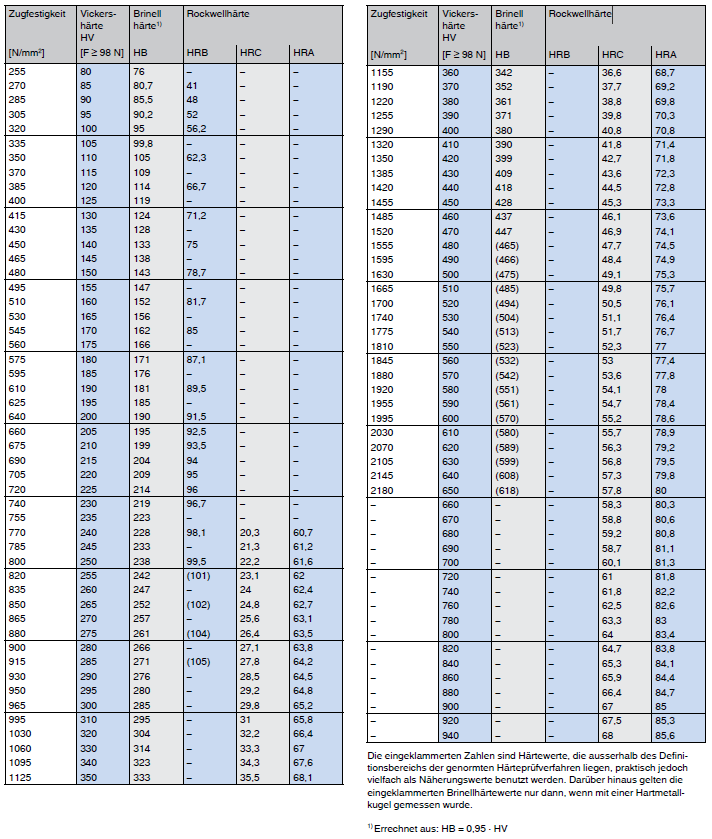 Die Umwertungstabelle für Härte in Härte sowie Härte in Zugfestigkeit für unlegierte und niedriglegierte Stähle und Stahlguss nach ISO 18265.