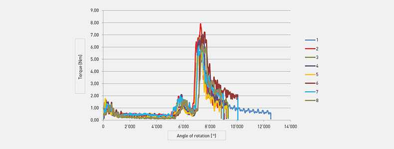 Målet med en momenttest er at sikre høj kvalitet og sikkerhed i dit produkt. Flere forskellige faktorer må tages i betragtning, før en skrueforbindelse kan anses for at være sikker. Punktet for overskridelse af tilspændingsmoment bør f.eks. ligge tilstrækkeligt langt fra det indskruningsmoment, der kræves for at skabe et gevind. Kun da kan det anbefalede tilspændingsmoment blive defineret på en pålidelig måde. Dermed kan du opnå vished om, at din skrue monteres korrekt og ikke svigter.