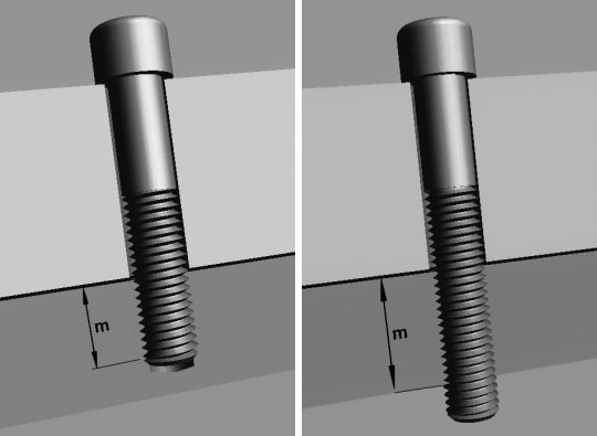 En pratique, la longueur d'engagement du filet est réduite par le début conique du filet de la vis ainsi que par le chanfrein de la pièce.