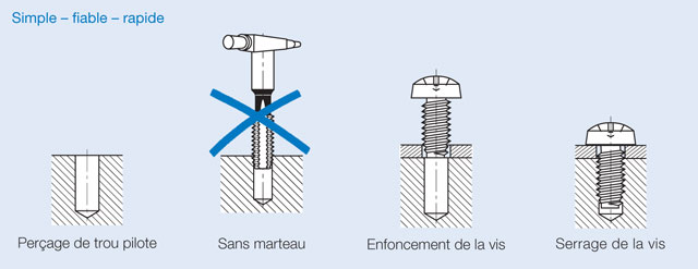 Les vis autoformeuses conformément à DIN 7500 peuvent être utilisées dans des matériaux malléables sans taraudage préalable.