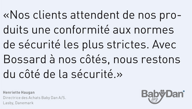 Bébé Dan (DK) développe et produit des textiles et des meubles pour bébé ainsi que des barrières de sécurité enfant. En tant que leader mondial dans la sécurité des enfants, Baby Dan dispose d’un siège à la Commission européenne qui traite de l'élaboration de nouvelles normes. Bossard Danemark a fourni différents types d'axes et d’écrous de blocage pour l'installation de la barrière à la maison. La nouvelle norme européenne EN1930:2011 spécifie les exigences de sécurité et les méthodes pour tester les barrières de sécurité enfant à la maison. Les barrières doivent être fixées aux ouvertures de manière à empêcher les enfants de plus de deux ans de les contourner.