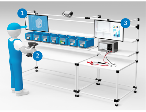 Digitale en interactieve werkinstructies: De centraal aanpasbare en flexibele werkinstructies vereenvoudigen het management van varianten aanzienlijk. De assemblagemedewerker wordt door het assemblageproces geleid en de werkstappen worden automatisch gedocumenteerd.