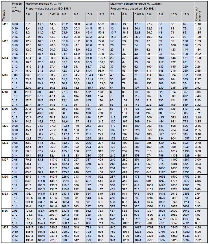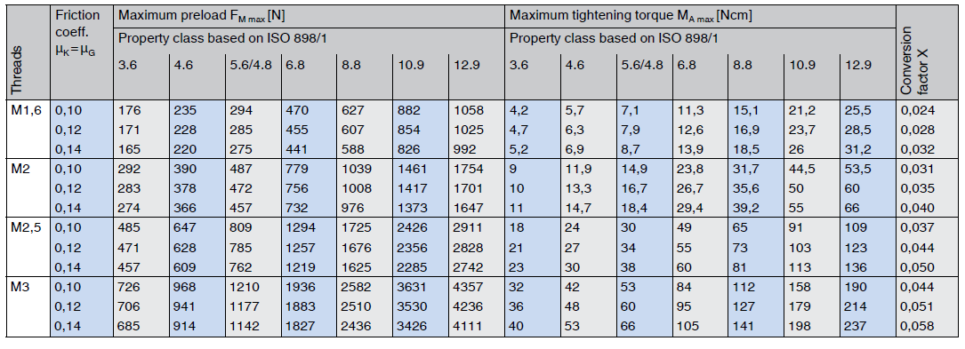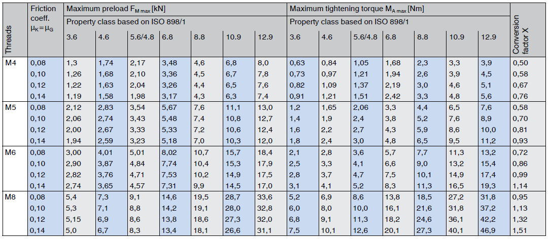 Tightening torque, tables F.049 and F.050 With MA = FM · X, the tightening torque can be calculated for other preloads (assuming the same friction coefficient and same thread size). |
