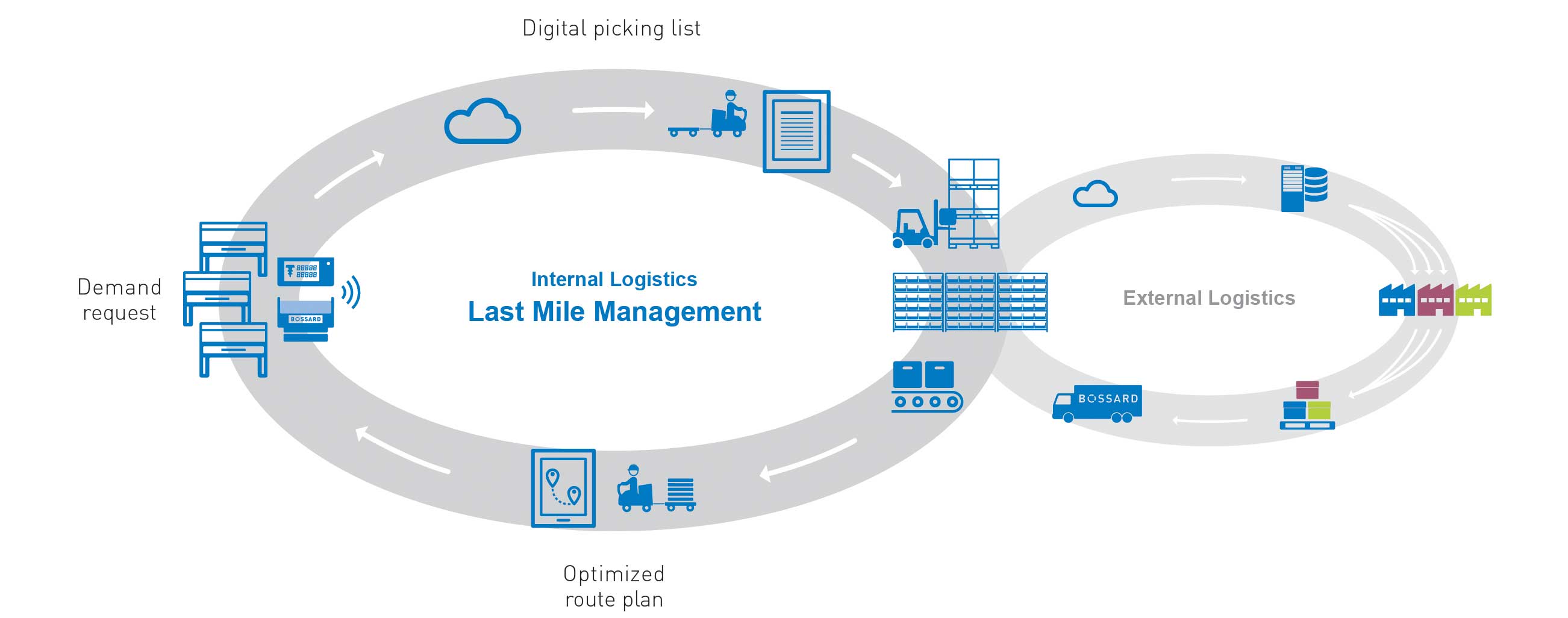 Last Mile Management is a simple solution for internal logistics. It refers to the «Last Mile» from the central storage locations to the work cells. Moreover, Last Mile Management fully supports the milk run / water spider by efficiently carrying out his material flow in a time-saving manner. In short, benefit from intuitive and paperless instructions for setup and replenishment, shorter paths and full transparency.