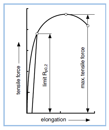 The yield point of somewhat harder materials is not sharply pronounced. It is then replaced by the stress at which the permanent elongation is 0.2 %. In practice, neither the working load of the fastener nor the stress from tightening should exceed the yield strength or the 0.2 % limit.