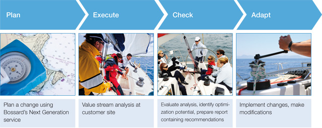 Bossard Next Generation is a comprehensive service for design and process optimization focused on boosting manufacturing productivity and lowering total cost of ownership (TCO) using value stream analysis. You receive a customized report containing concrete recommendations for action.