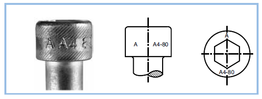 Bolts from nominal diameter M6 must be marked on the unthreaded shank with the steel group, the property class and the manufacturer’s mark. If marking on the on the unthreaded shank is not possible, marking on the nut-end of the stud with only the stainless steel group is allowed.